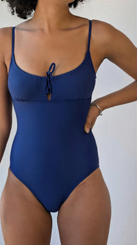 This one piece is the perfect fit for a majority of shapes. Cheeky cut, with a low cut back design, it has the most bust support than all the one pieces because of the under-bust elastic tighten to you convenience by the straps. Also the only one piece that comes with removable foam cups.